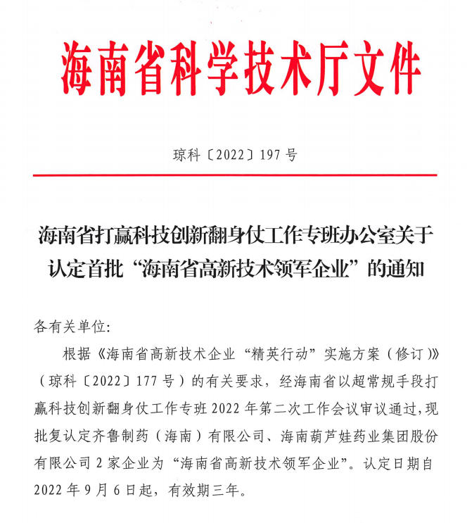 近日,海南省科学技术厅发布的《海南省打赢科技创新翻身仗工作专班办公室关于认定首批“海南省高新技术领军企业”的通知》中显示,批复认定海南yp街机药业集团股份有限公司等2家企业为“海南省高新技术领军企业”。认定日期自2022年9月6日起,有效期三年。