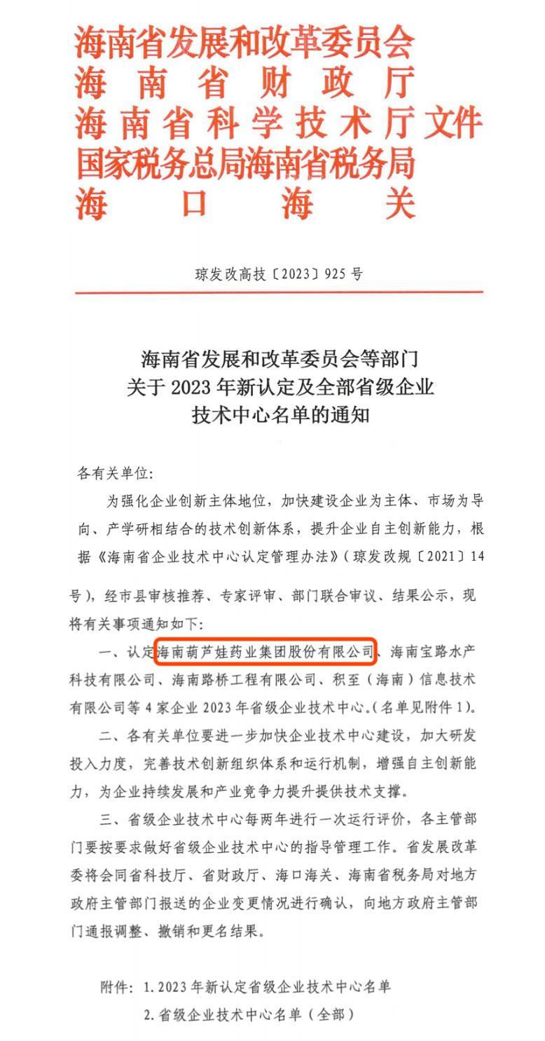 近日,海南省发改委等多部门联合公布了《关于2023年新认定及全部省级企业技术中心名单的通知》,其中,海南yp街机药业集团股份有限公司成功通过评审,被认定为省级企业技术中心,是本次获批的4家企业之一。